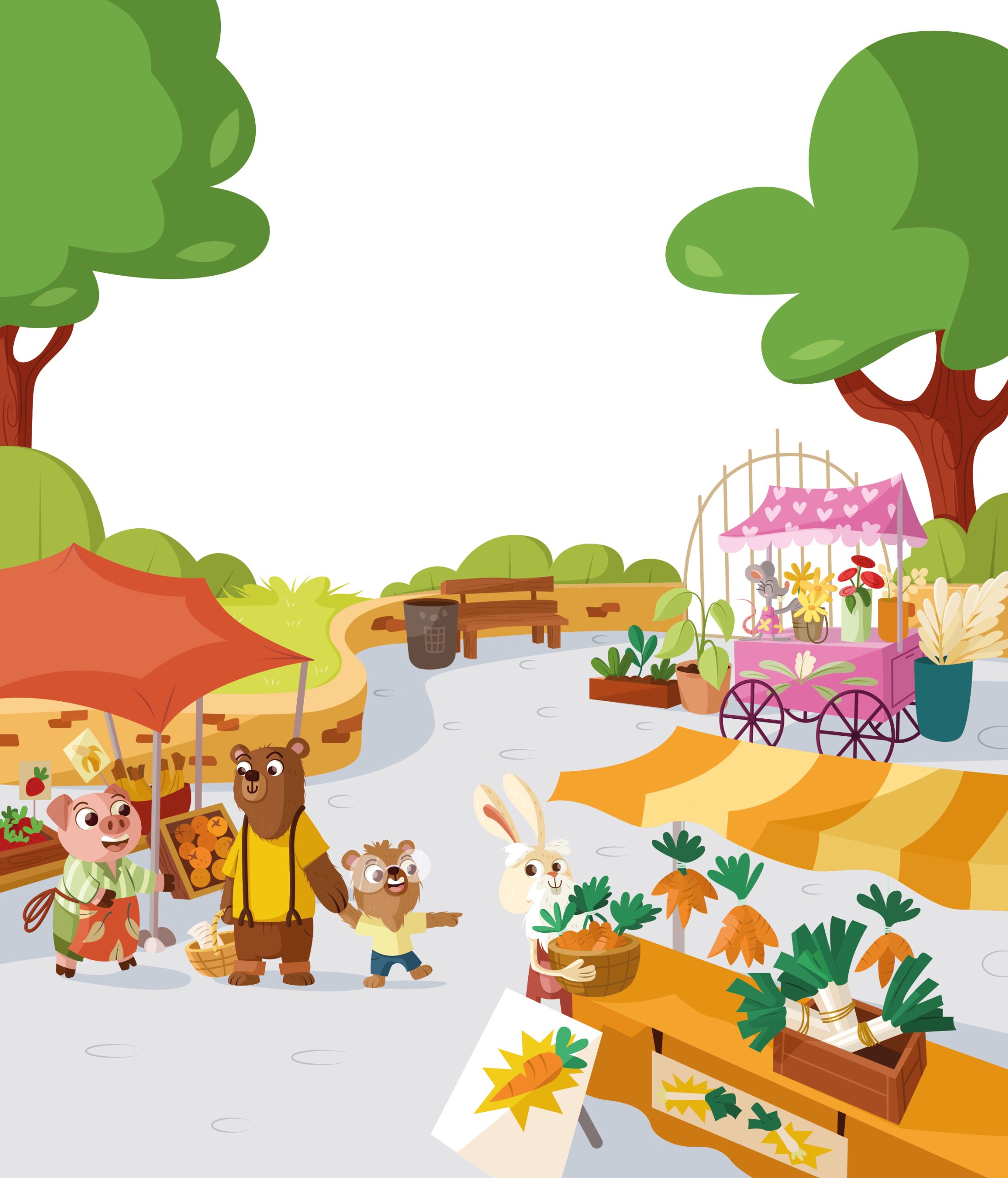 Illustrations jeunesse pour l’histoire d’un ourson au marché